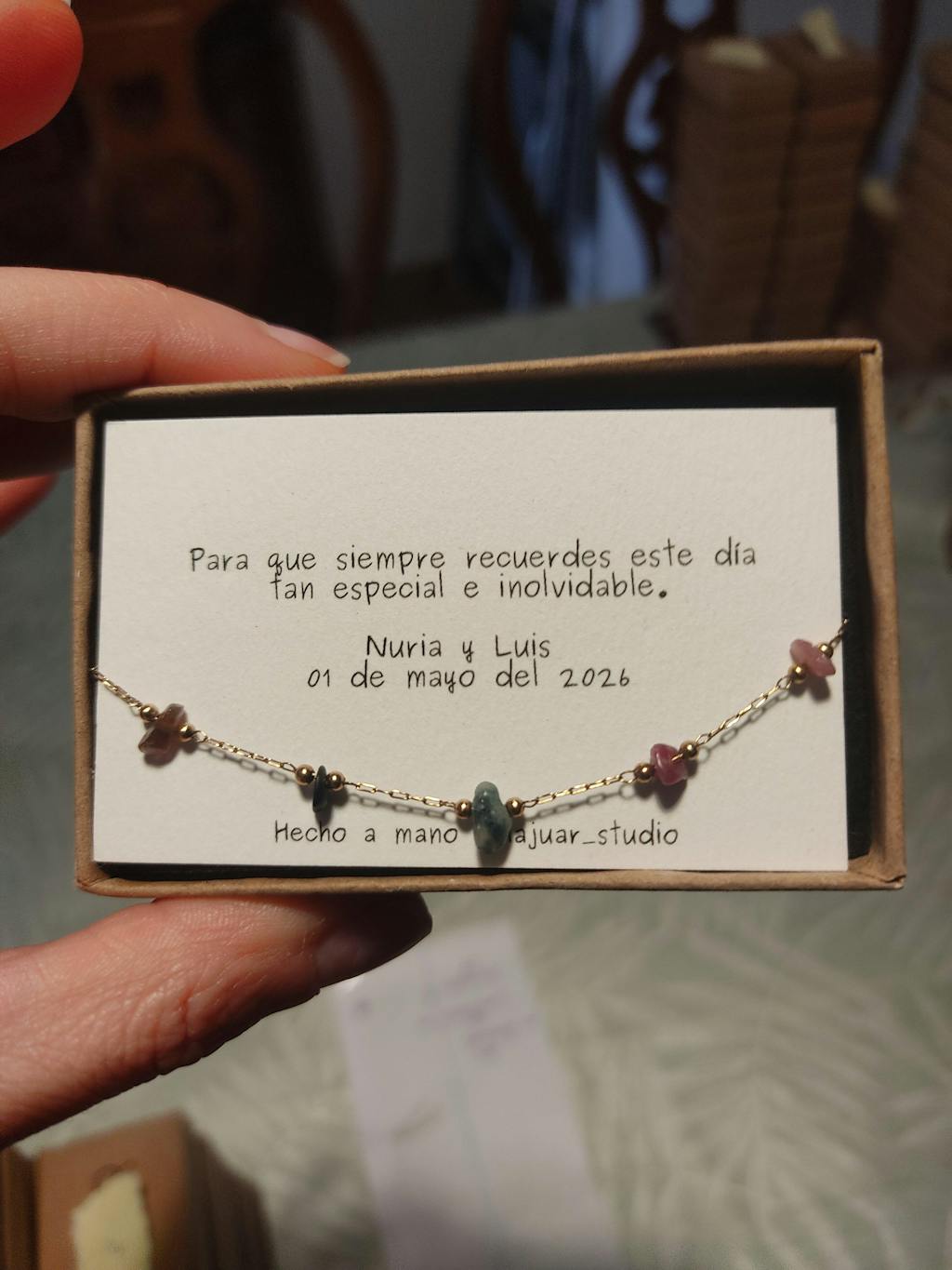 Pulsera de cadena y piedras naturales, hecha a mano con mucho mimo. Se entrega en una cajita con el texto personalizado que quieras como dedicatoria. La pulsera cuenta con una cadena alargador para que se pueda adaptar al tamaño idóneo de muñeca.