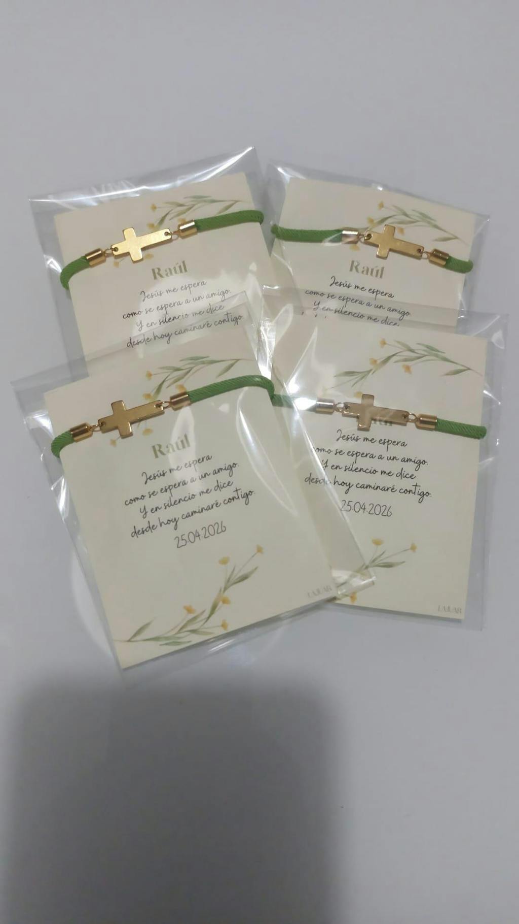 Pulsera con cordón grueso y charm de cruz apaisada, hechas a mano en el taller, acompañado de una tarjeta recordatorio personalizado, diseñada a medida.